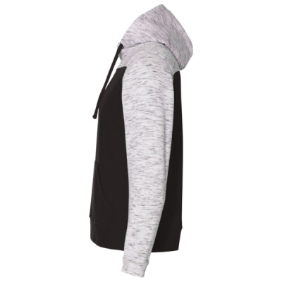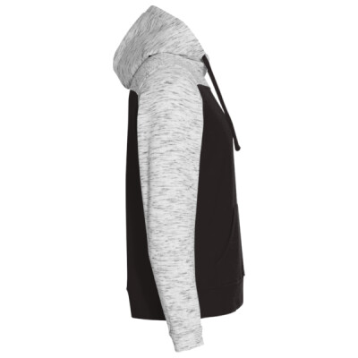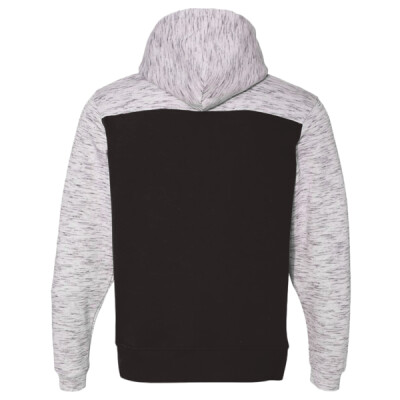 - Contrast melange fleece on hood, shoulders, and sleeves