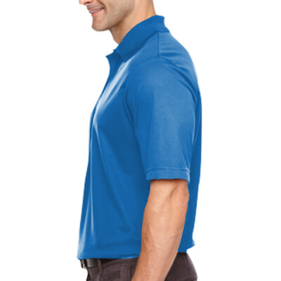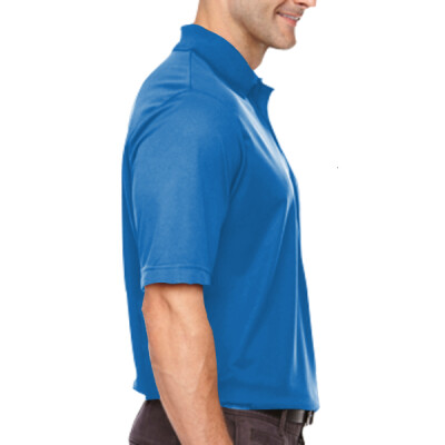100% polyester pique, 4.1 oz./yd2/140 gsm; Moisture wicking, antimicrobial and UV protection performance; matching flat knit collar; heat seal label;