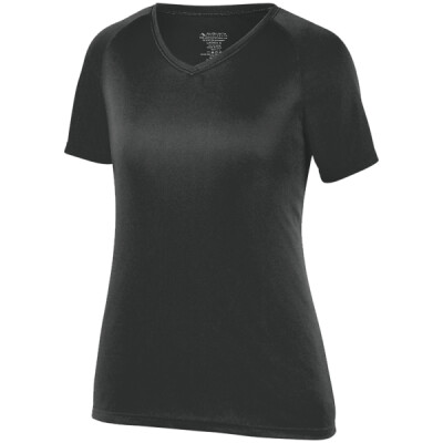 100% polyester wicking knit with True Hue Technology ; Tru Hue Technology prevents dy migration ; Wicks moisture away from the body ; 100% polyester ; Wicking knit with true hue technology™ that helps prevent dye migration; Wicks Moisture; Girls fit; Updated fit has longer length and bigger chest for added comfort; Tear away label; V-neck collar ; Raglan sleeves;